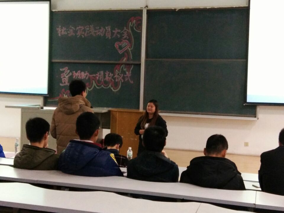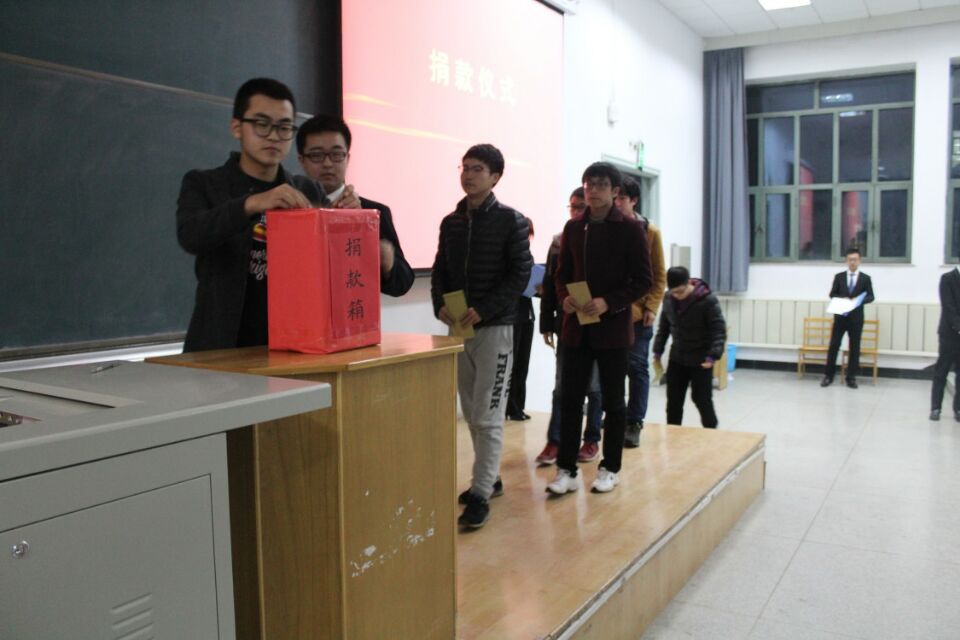 阳光爱心学校于11月25日在逸夫教育大楼B416教室举办社会实践动员大会暨班助一捐款仪式。长春益行事业发展中心项目人员唐玮玮、阳光爱心学校副校长于奥博、张龙华、2015级学生代表及2016级全体同学出席此次大会。