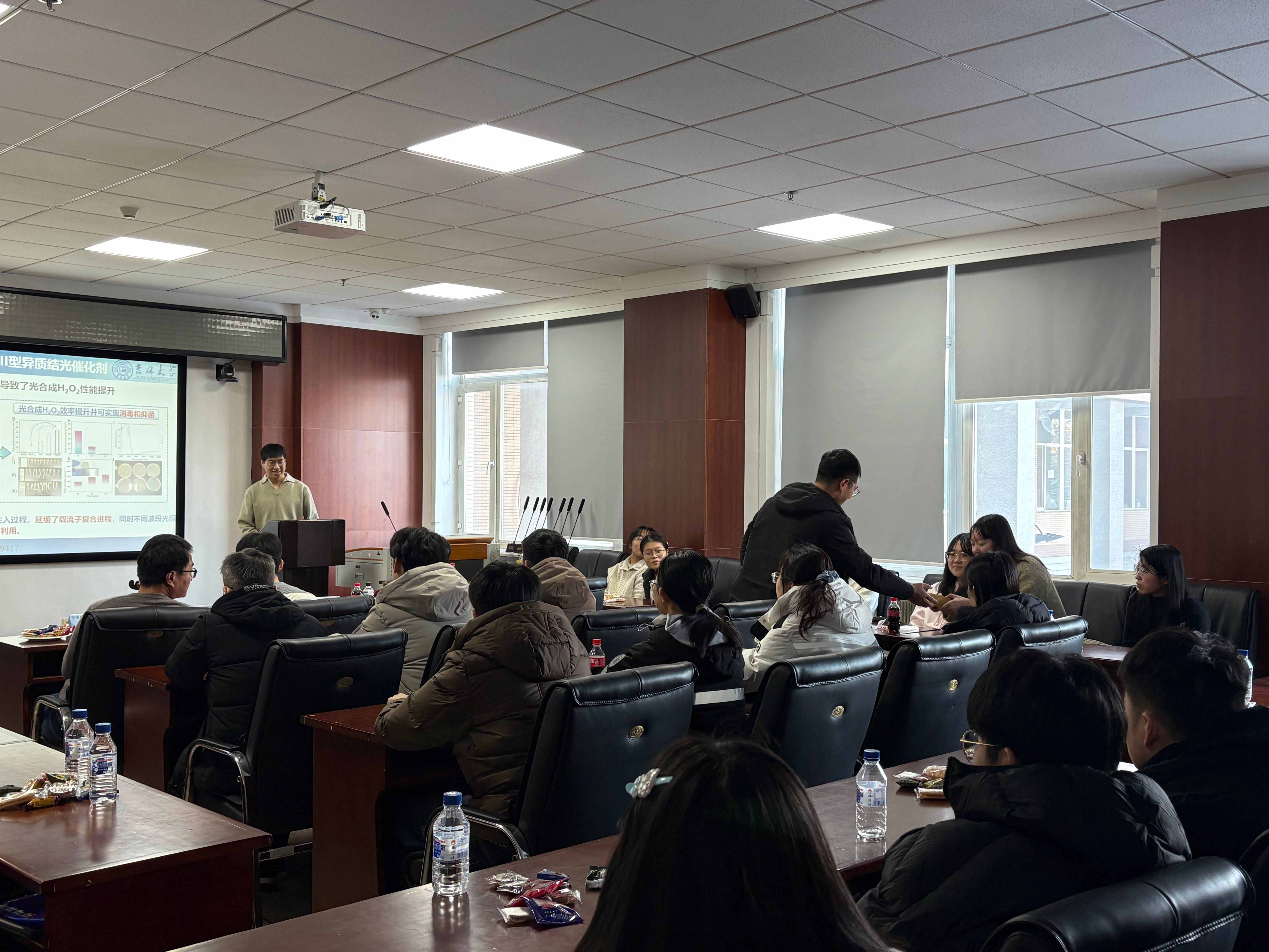 许明华同学(2023级博士研究生)分享的内容是关于人工光能-化学能转化系统的设计与优化研究。在光催化领域,利用太阳能驱动特定氧化还原反应是实现清洁能源转化与污染物降解的重要途径,已成为缓解能源与环境问题的研究热点。然而,当前光催化体系普遍存在太阳光谱利用率与光生载流子分离效率不匹配的问题,制约了其性能提升与规模化应用,构成了该领域亟待解决的关键技术瓶颈。针对这一挑战,本研究提出一种将局域表面等离激元(LSPR)效应与异质结工程相结合的新策略,旨在协同实现宽光谱响应与高效载流子分离,为构建高性能人工光合成系统提供了新的理论依据与技术路径。该研究成果不仅有助于深化对光能-化学能转化过程中光谱利用与电荷传输机制的理解,也为高效光催化材料与器件的设计与开发开拓了新思路。